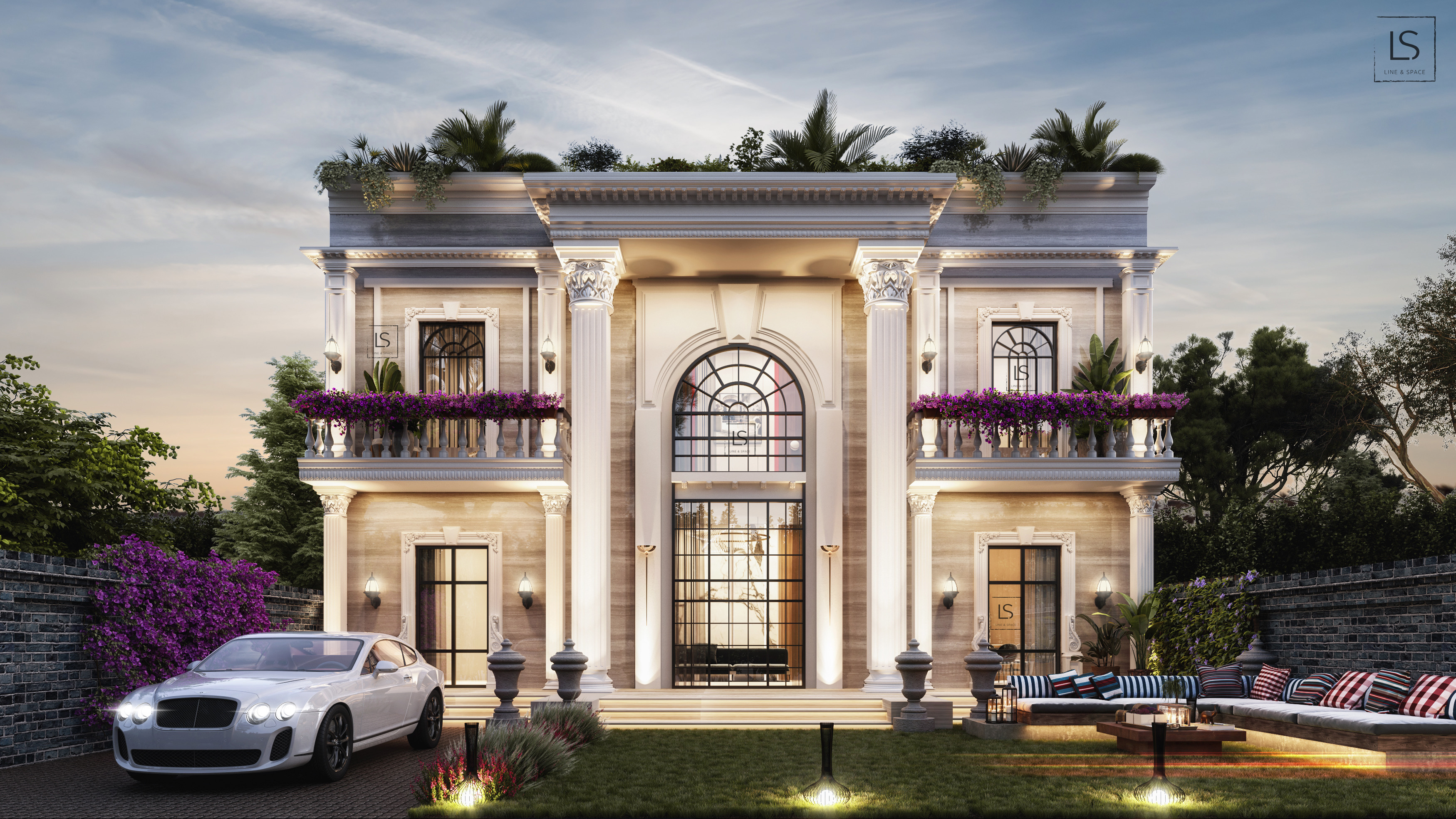 Harking back to the harmonious forms of ancient Greece and Rome, this neoclassical architectural styled home is characterized by its simplicity, symmetry, and grandeur, with towering intricate columns, central semi-circular arch with a key stone, and flat roof with mouldings among its most recognizable elements.
